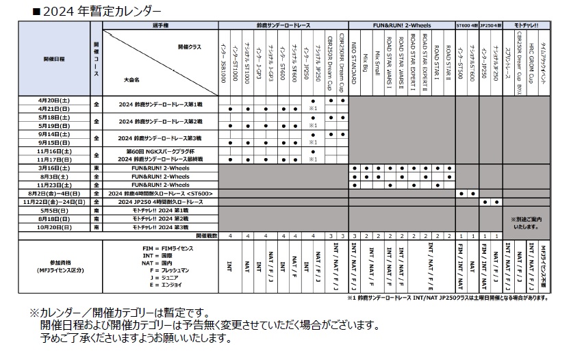 ☆速報☆ 投稿日時: 2023年12月21日 投稿者: hibinodekigoto 例の2024年鈴鹿レ-ス日程は2輪の日程が正しいそうで先に決まっていた4輪JAF・GPが移動との事なので弊社主催レ-ス2024年の日程も最終調整してまもなく発表!(エントリ-も同時に開始)