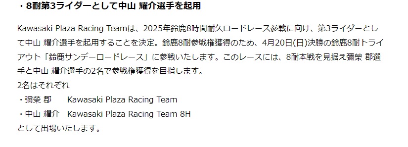 漢カワサキで鈴鹿8耐へ、しかも凄い体制🥳