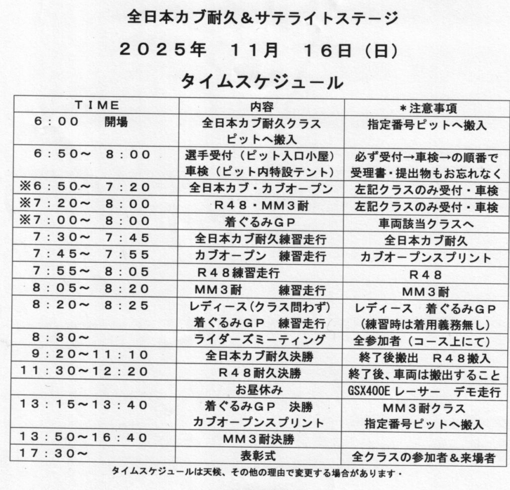 11月16日(日)の全日本カブ耐久&サテライトステ-ジ最終戦は