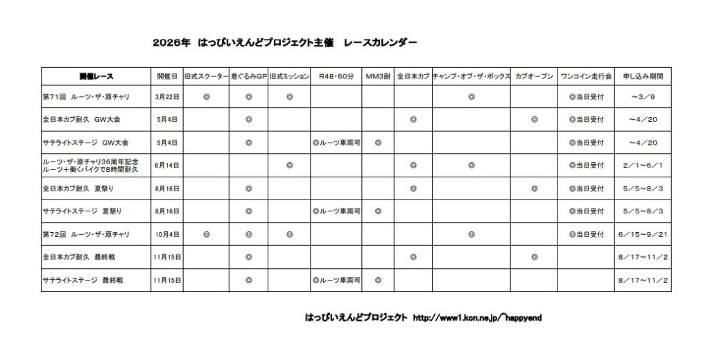 3月ル-ツ・ザ・原チャリ、5月全日本カブ耐久&サテライトステ-ジ